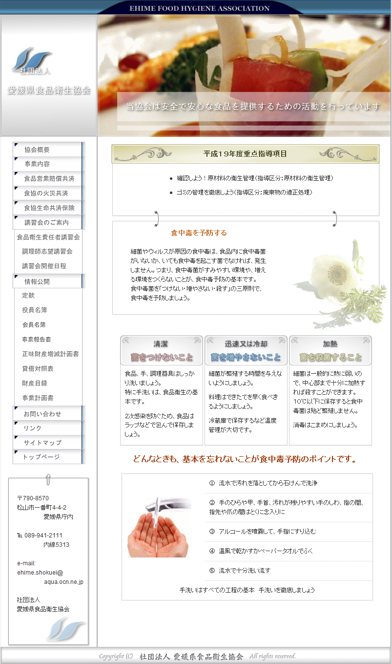 食品衛生に関する各種案内や事業内容、講習会情報などを目的別に分かりやすく分類し、必要な情報へ迷わずアクセスできる構成としています。