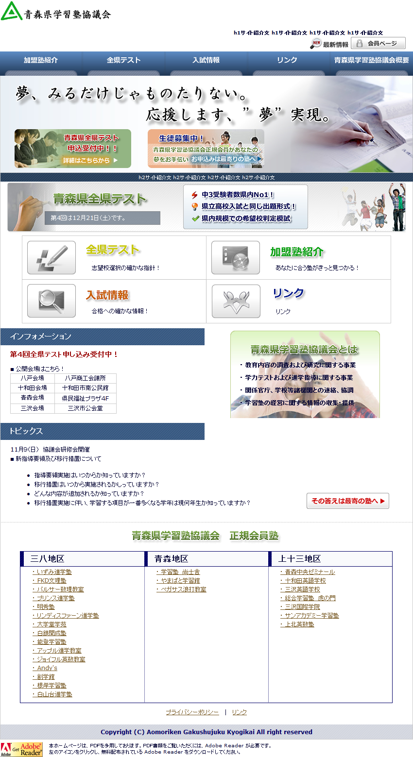 青森県内の学習塾を支援する団体として、県立高校入試情報・全県テストなどの重要情報をわかりやすく届けたいとのご相談をいただきました。情報更新頻度が高く、受験生・保護者・加盟塾どなたにも見やすい構造と導線が求められていました。