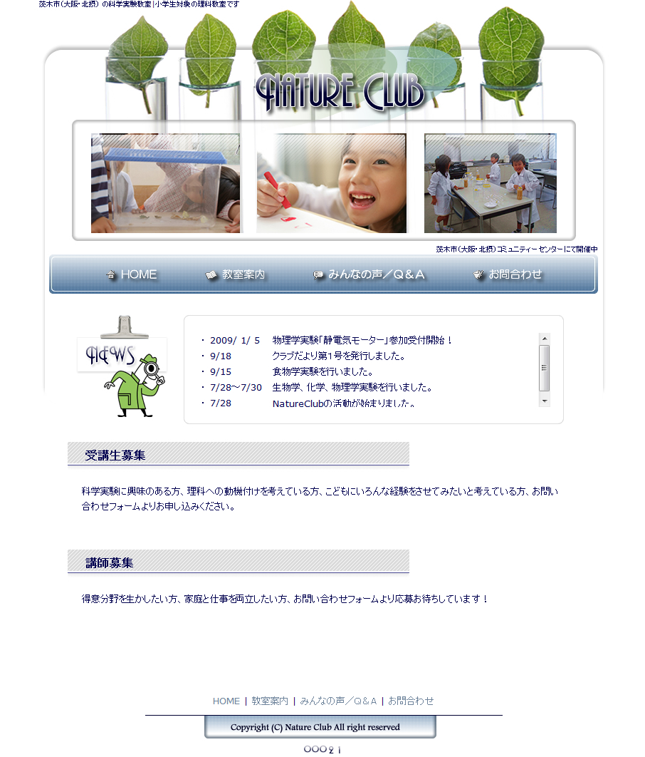 理科実験や自然科学に興味を持つ子どもや保護者に向けて、Nature Club様が提供する教育プログラムや教室の情報を、分かりやすく伝えたいとのご相談でした。特に、体験や実験の魅力・受講の流れ・講師募集情報の導線を整理し、初めて訪れた方でも迷わず必要な情報にたどり着けるサイトが求められていました。